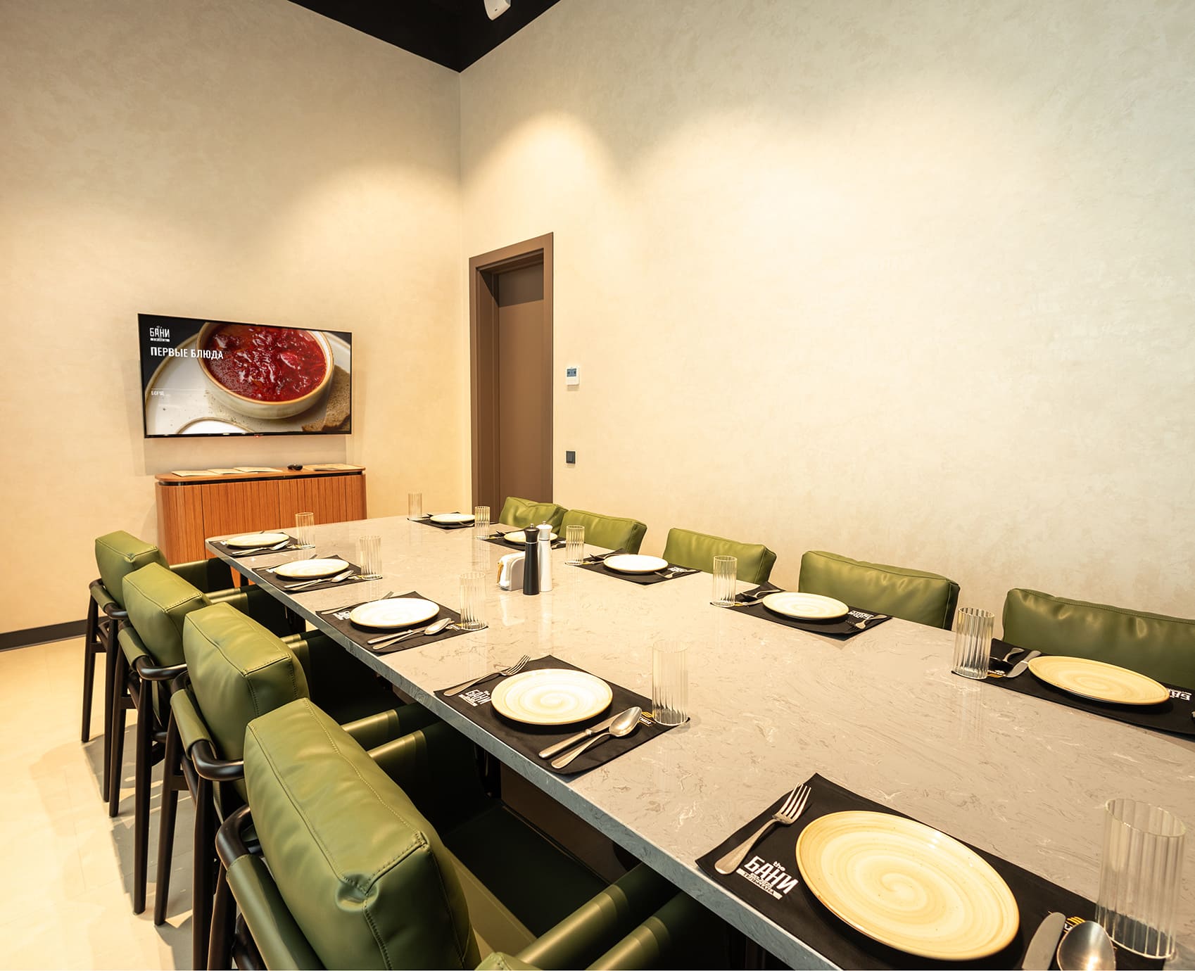 У нас работает собственная кухня, и мы всегда можем предложить вам большой выбор свежеприготовленных блюд. Кухня банного комплекса «The БАНИ» не разочарует даже самых искушенных гурманов.
